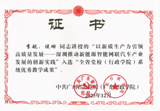 学院案例课程《以新质生产力引领高质量发展——深圳推动新能源智能网联汽车产业发展的创新实践》荣获2025年广东省党校(行政学院)系统优秀教学成果奖。